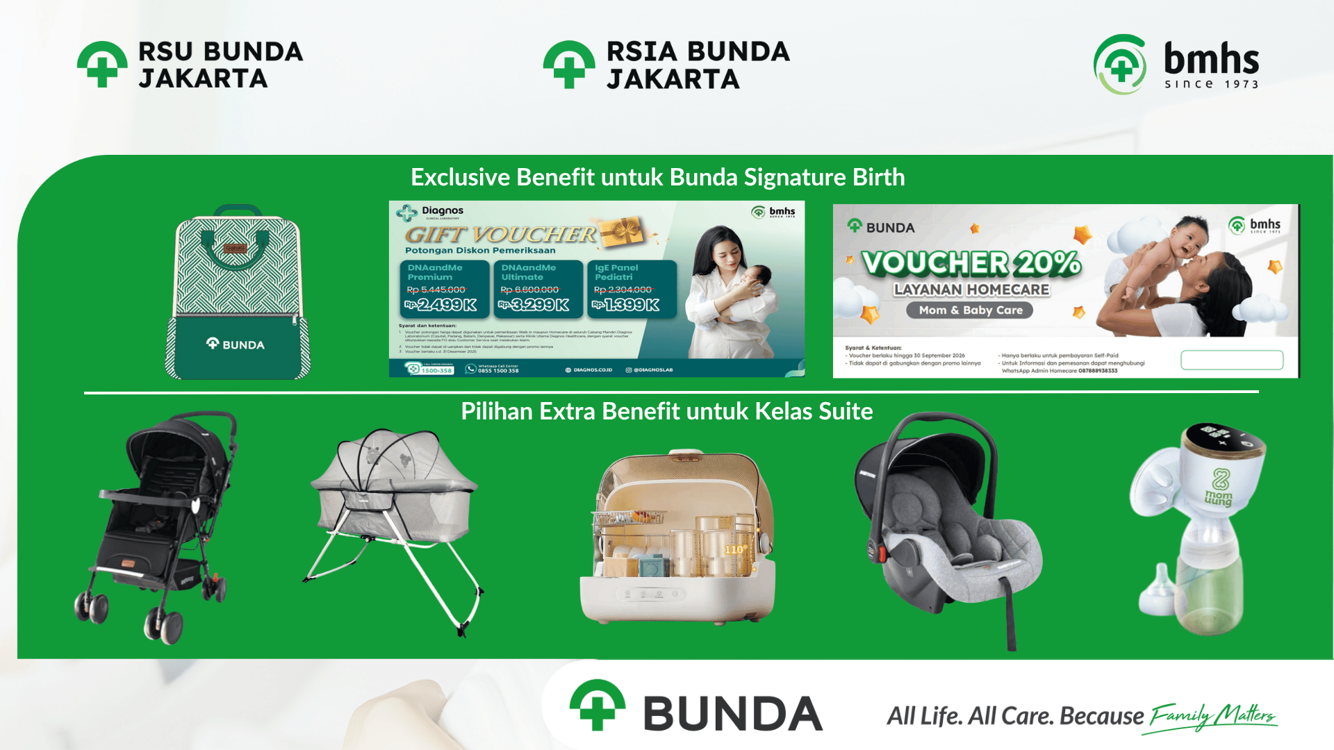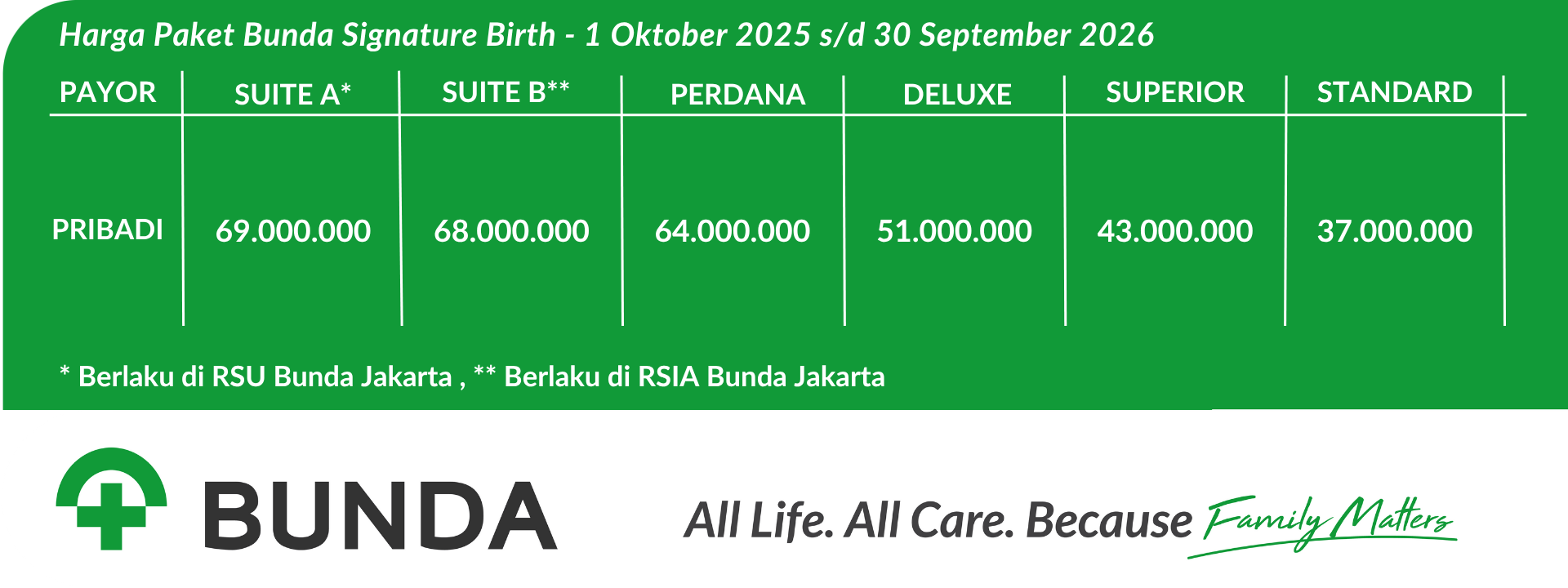 Kami dengan bangga menghadirkan rangkaian layanan eksklusif "Bunda Signature", yang terdiri dari Paket Antenatal Care (ANC) Bunda Signature Care dan Paket Persalinan Sectio Caesarea (SC) Bunda Signature Birth.